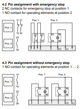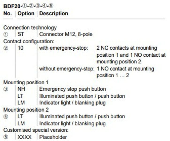 Koteloa on saatavana kahtena perusversiona. Toisessa on hätäseispainike (2NC kosketinta) ja yksi valinnainen ohjauskaluste (1 NO-kosketin) ja toisessa 2 valinnaista ohjauskalustetta (1 NO-kosketin).