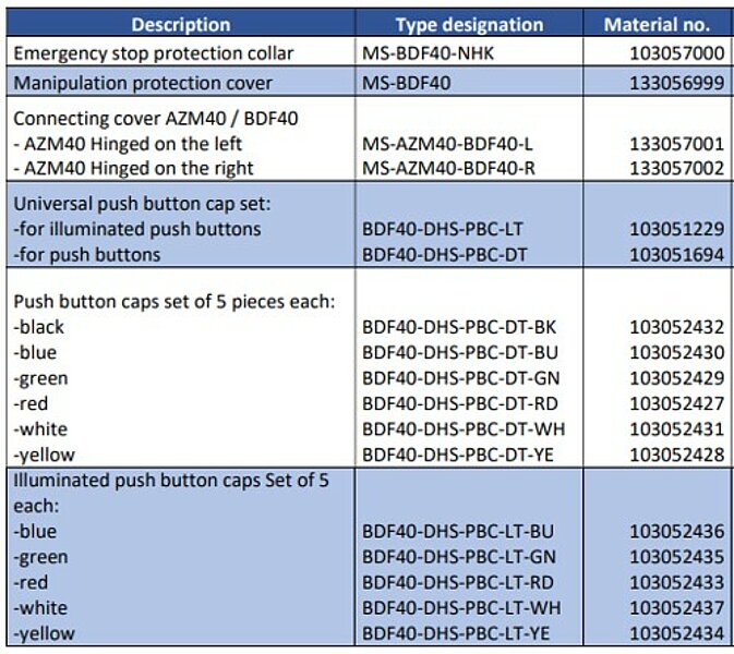 Ohjauspainikekotelon mukana tulevat valoa läpäisevät kannet valopainikkeita ja merkkilamppuja varten (punainen, vihreä, sininen, keltainen ja valkoinen) sekä valoa läpäisemättömät kannet mikäli halutaan vain painike ilman valoa (punainen, vihreä, sininen, keltainen, valkoinen, harmaa ja musta). Painikkeiden kansia on mahdollista tilata myös erikseen.