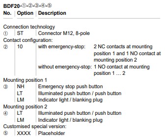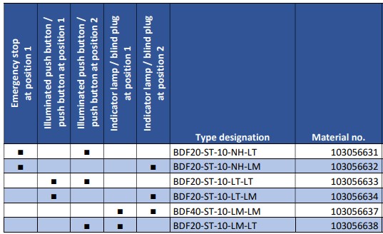 BDF20-sarjan malli, jossa on hätäseispainike ja valinnainen paineke, menee myös suoraan SFB:hen, mutta kahden valinnaisen painikkeen malli ei.
